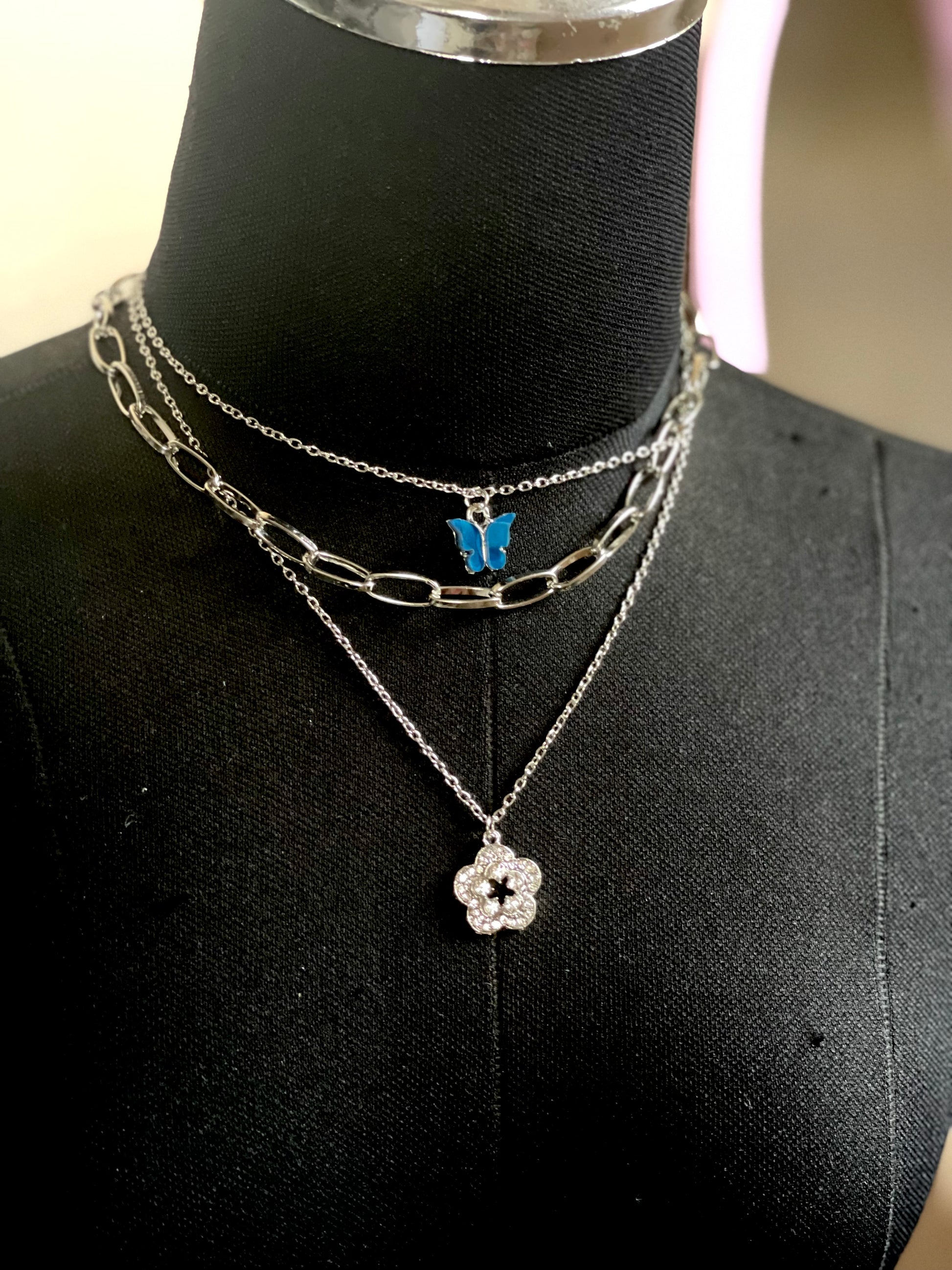 Silver metal novelty necklace with 3 layers, a clasp and butterfly pendant.