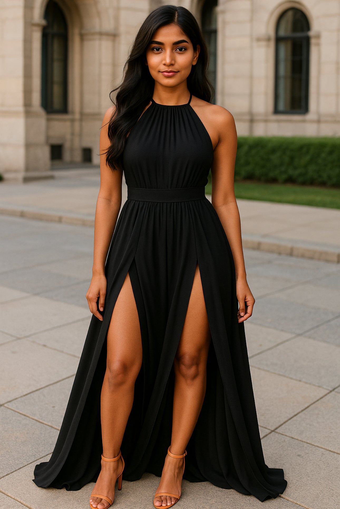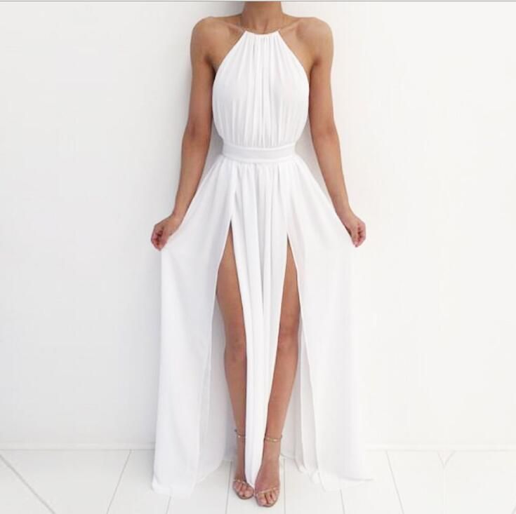 Turn heads in the Cleopatra White Dress, featuring a flirty halter neck and daring low back. The high slits add a playful touch, perfect for twirling through cocktail hour during a sunny oceanside day!