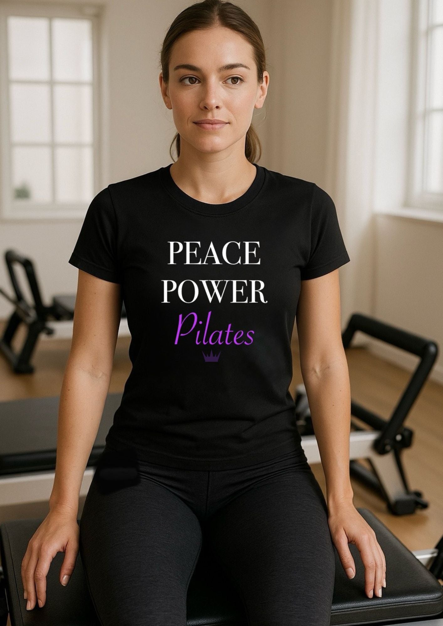 This Peace Power Pilates T-shirt is designed to fit ladies perfectly, blending confidence with comfort. Its flattering cut moves with you, making every stretch and step feel effortless. Whether you're powering through Pilates or just embracing your day, this tee adds a playful boost to your wardrobe.