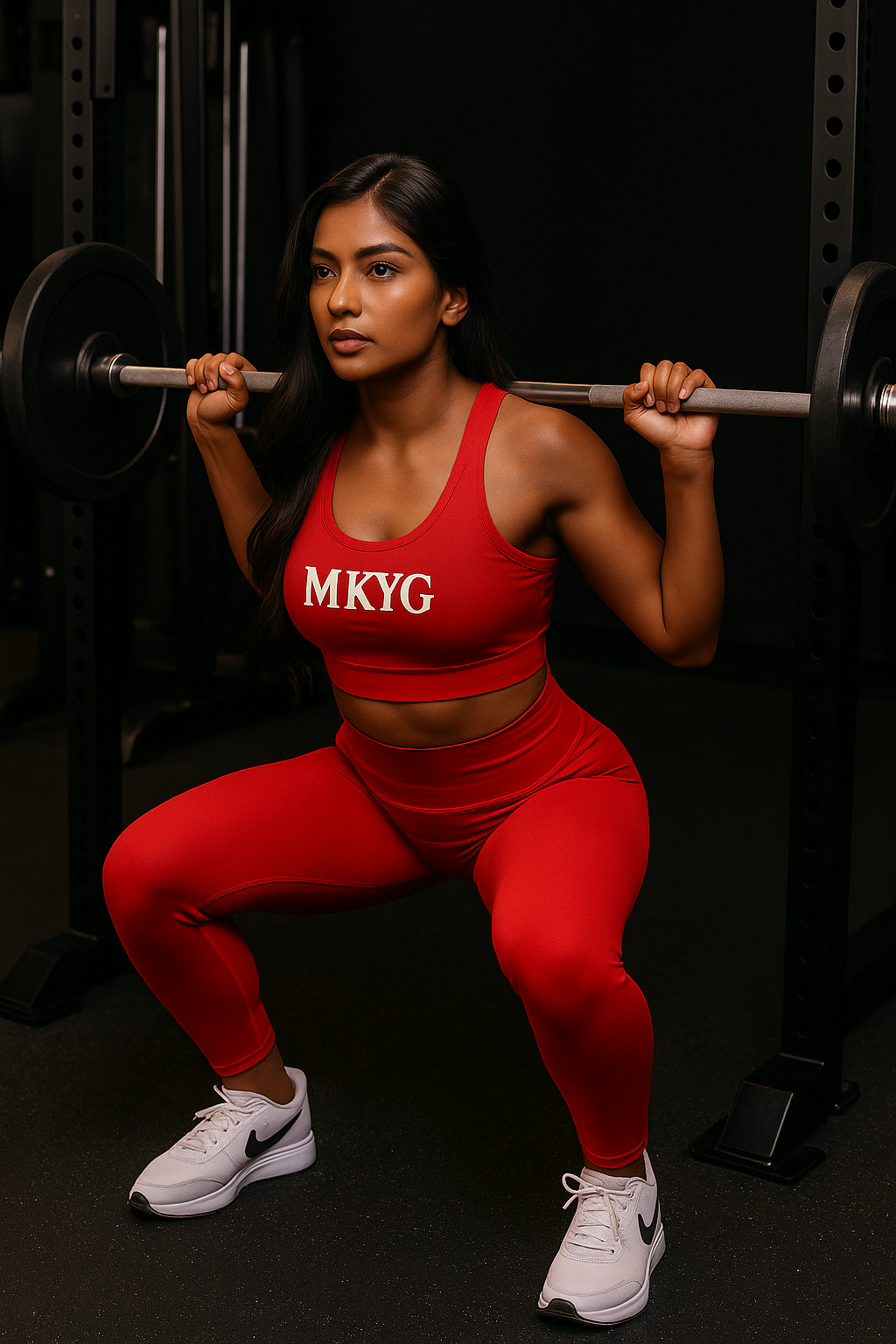 Turn heads in our bold red crop top + full-length leggings set, designed for strength, confidence, and style.