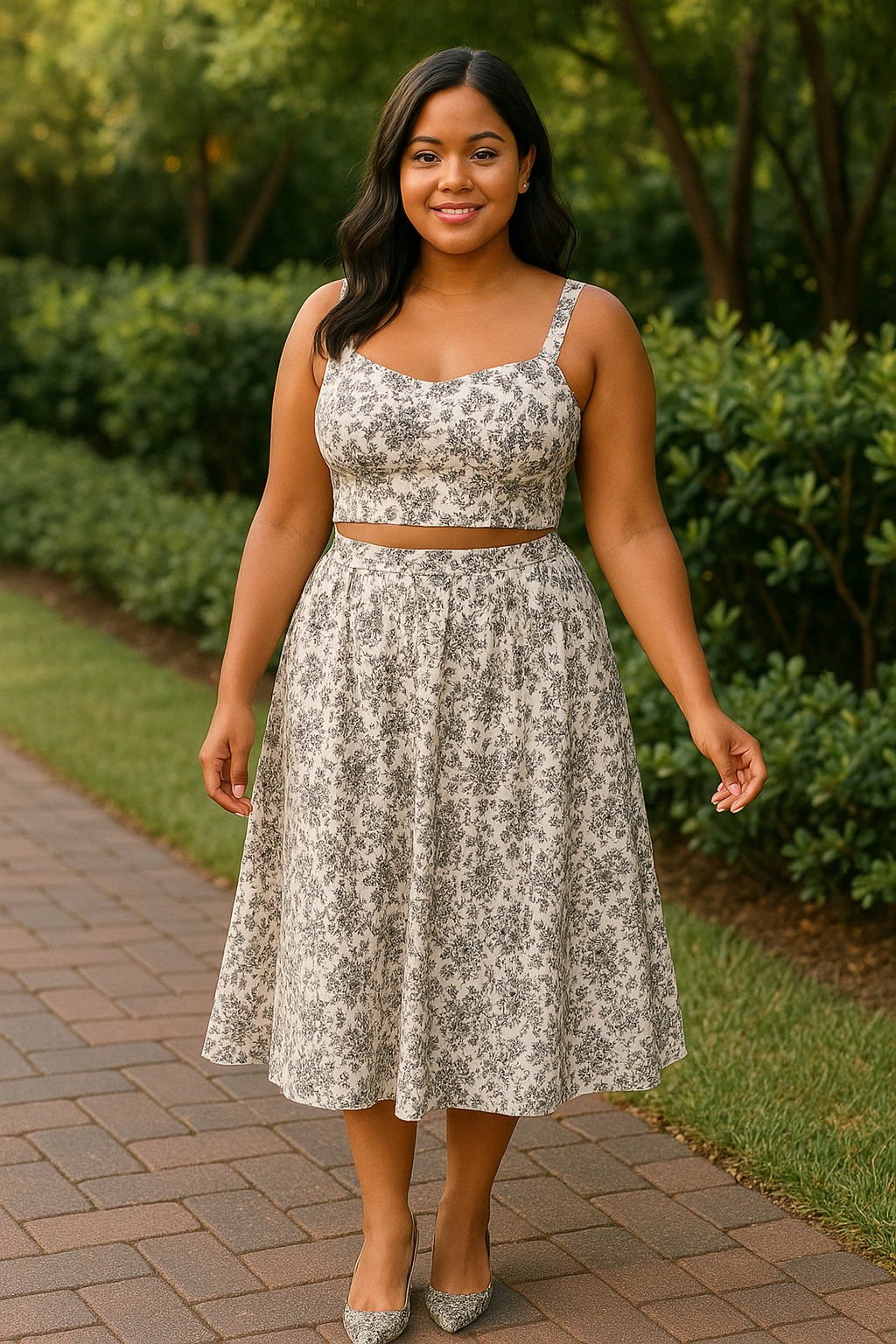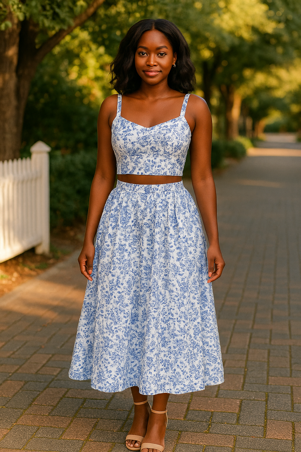 Effortlessly chic and breezy, the Santorini Skirt Set brings holiday vibes to your everyday wardrobe. Featuring a fitted cropped top with delicate straps and a flowing high-waist A-line skirt, this set is crafted in a fresh white-and-blue floral print reminiscent of Greek island charm. Perfect for sunny strolls, brunch dates, or summer getaways, this set pairs comfort with elegance — just add sandals and your favourite smile.